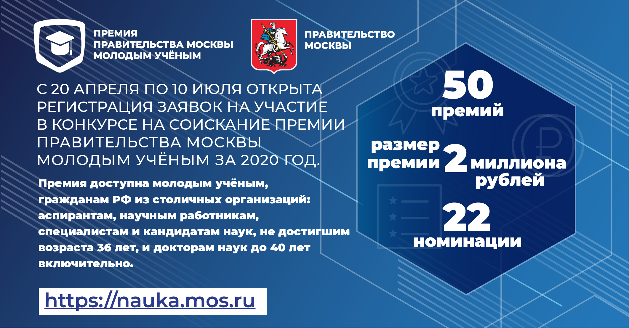 С 20 апреля 2020 года открылась регистрация заявок на конкурс на соискание премии Правительства Москвы молодым ученым за 2020 год.