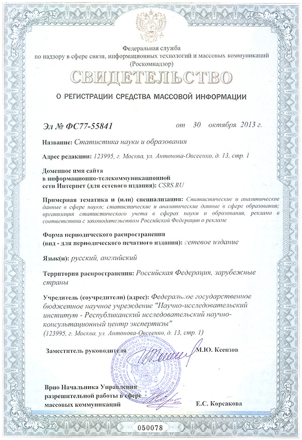Издание ФГБНУ НИИ РИНКЦЭ "Статистика науки и образования" зарегистрировано как средство массовой информации